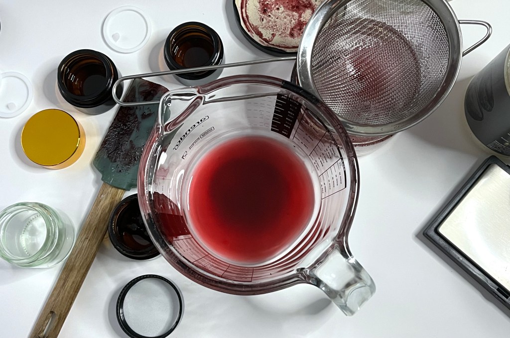 1. Prepare the almond oil by macerating it with 4g beetroot powder, 2g hibiscus powder, and up to 0,5g Alkanaroot. Place the mixture in a warm water bath on low heat for several hours, then let it sit overnight.
