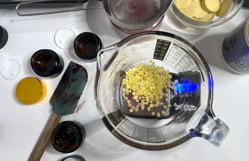 6. Take the beaker from the warm water and keep stirring, before the wax solidifies, stir in the Vitamin E drops for preservation and the honey for its antioxidant and nourishing properties.