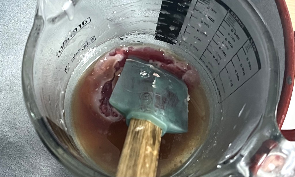 8. Finally, I thoroughly scrape out the measuring cup with a spatula to make sure none of the lip butter goes to waste. There’s about a five-minute difference between the two pictures.