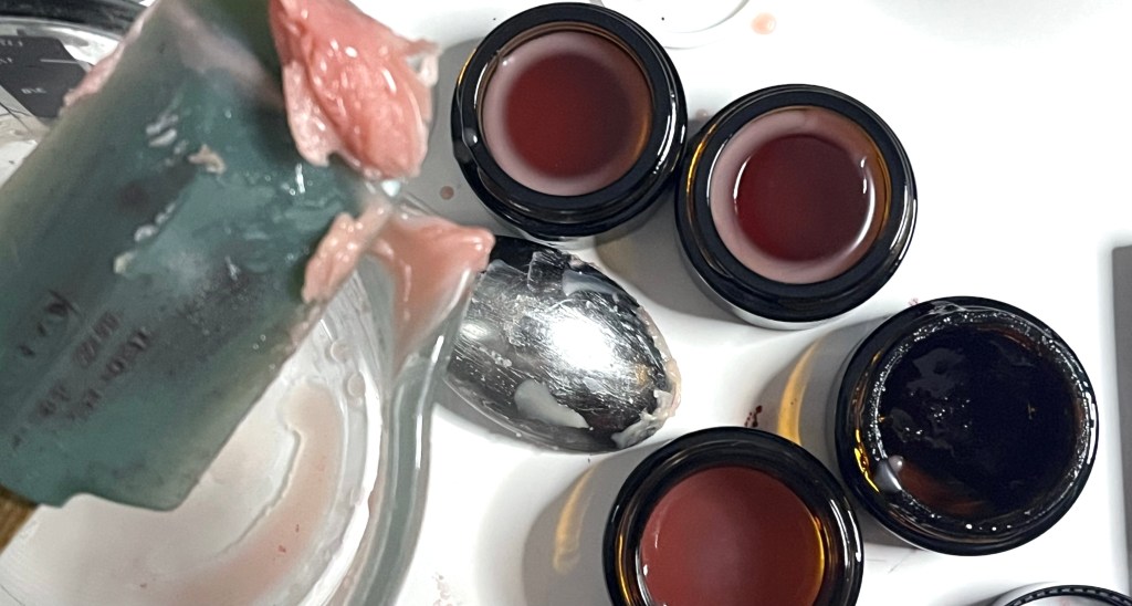 The color is nice, but it’s barely visible on the lips. To achieve more of a lip tint, you’d need to increase the amount of colored ingredients. Another option is to double-infuse the oil—filter it and infuse it again with the plant powders.